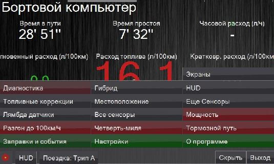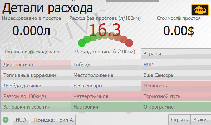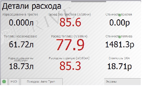 Экран описывает основные показатели текущей поездки либо выбранного интервала времени. Позволяет оценить как совокупную эффективность и стоимость пробега, так и мгновенные показатели расхода. Большинство показателей отображаются для выбранного интервала поездки (по умолчанию - текущая поездка).