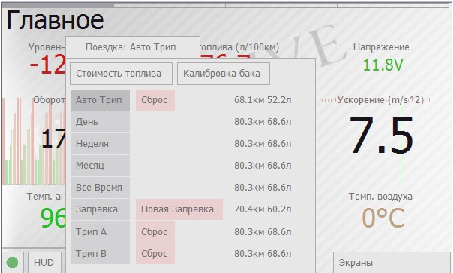Сенсоры с зеленым индикатором означают возможность дополнительной их настройки. При нажатии на показания стоимости откроется экран с настройкой текущей стоимости литра топлива и используемой для отображения валюты. Вы можете выбрать название валюты из списка, либо ввести свое собственное.