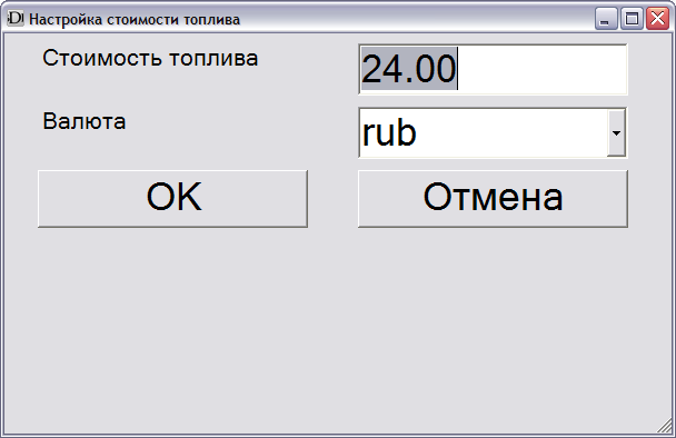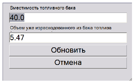 При нажатии на один из сенсоров уровня топлива откроется диалог калибровки топливного бака. При первом использовании программы необходимо ввести объем вашего бака, и (примерное) количество уже потраченного топлива.
