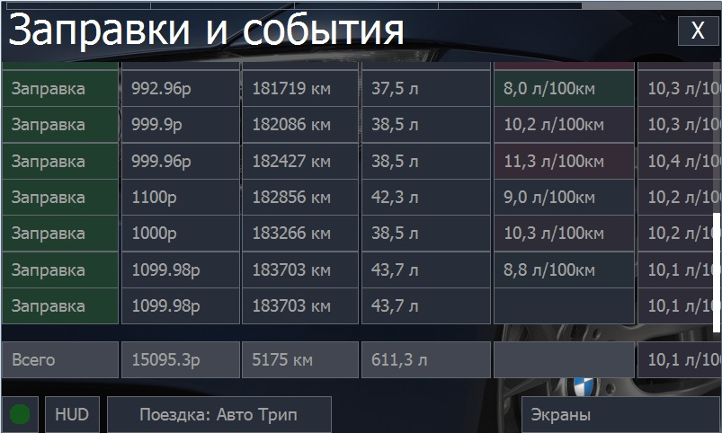 Экран служит для анализа информации по заправкам и событиям, сохраненных хобдрайв-ом.