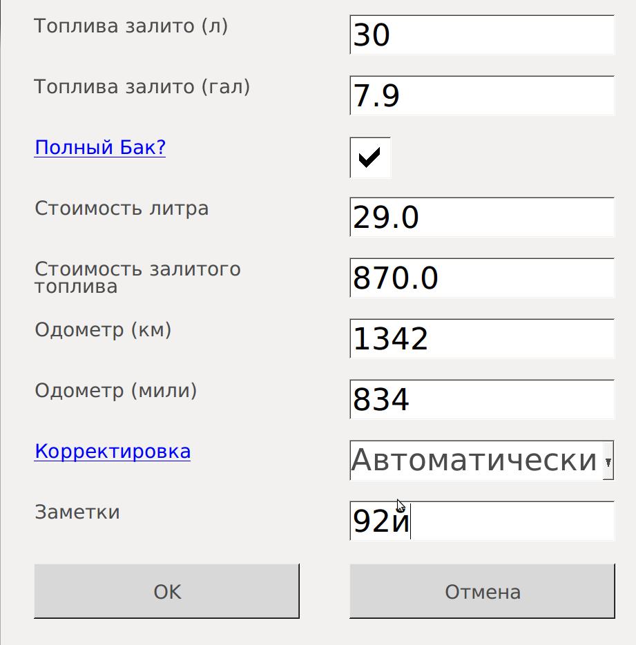 При каждой заправке, выбрав «Действия» → «Новая заправка», в диалоге необходимо ввести данные о залитом топливе: