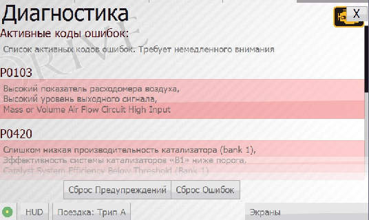 Кнопка «Сброс Ошибок» позволяет сбросить текущие коды ошибок. Удостоверьтесь что вам не нужна эта информация, так как вместе с ней сотрутся данные “Freeze Frame”, которые возможно будут полезны при детальной диагностике в сервисе.