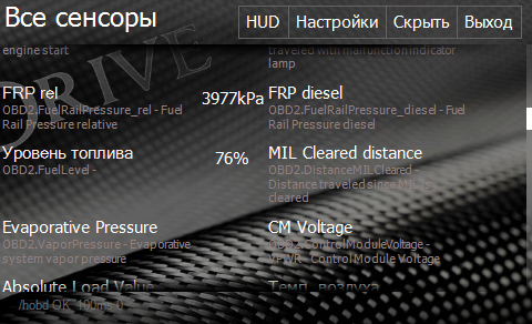 Все датчики (сенсоры) считываются последовательно, скорость обновления может зависеть от производительности вашего ELM-адаптера и устройства на котором запущен хобДрайв. Задержка в чтении показаний может достигать 1-2 секунд.
